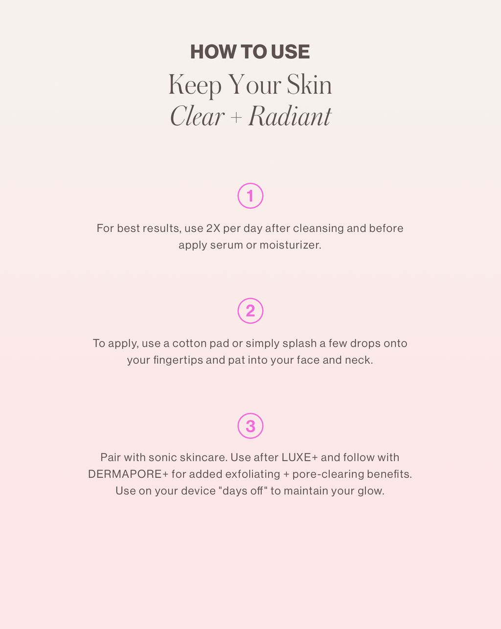 Toners boost exfoliating benefits and prepare your skin for the rest of your routine. It’s a quick and easy step to enhance your results!