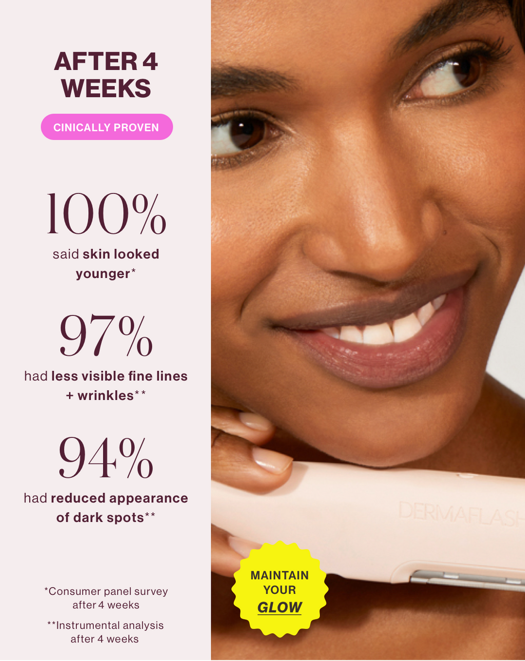 Apply DERMAFLASH Botanical Ketoacid Toner, followed by DERMAFLASH Active Cocooning Serum for instant hydration and glow. Flash 1X per week to maintain smooth, radiant, fuzz-free skin.