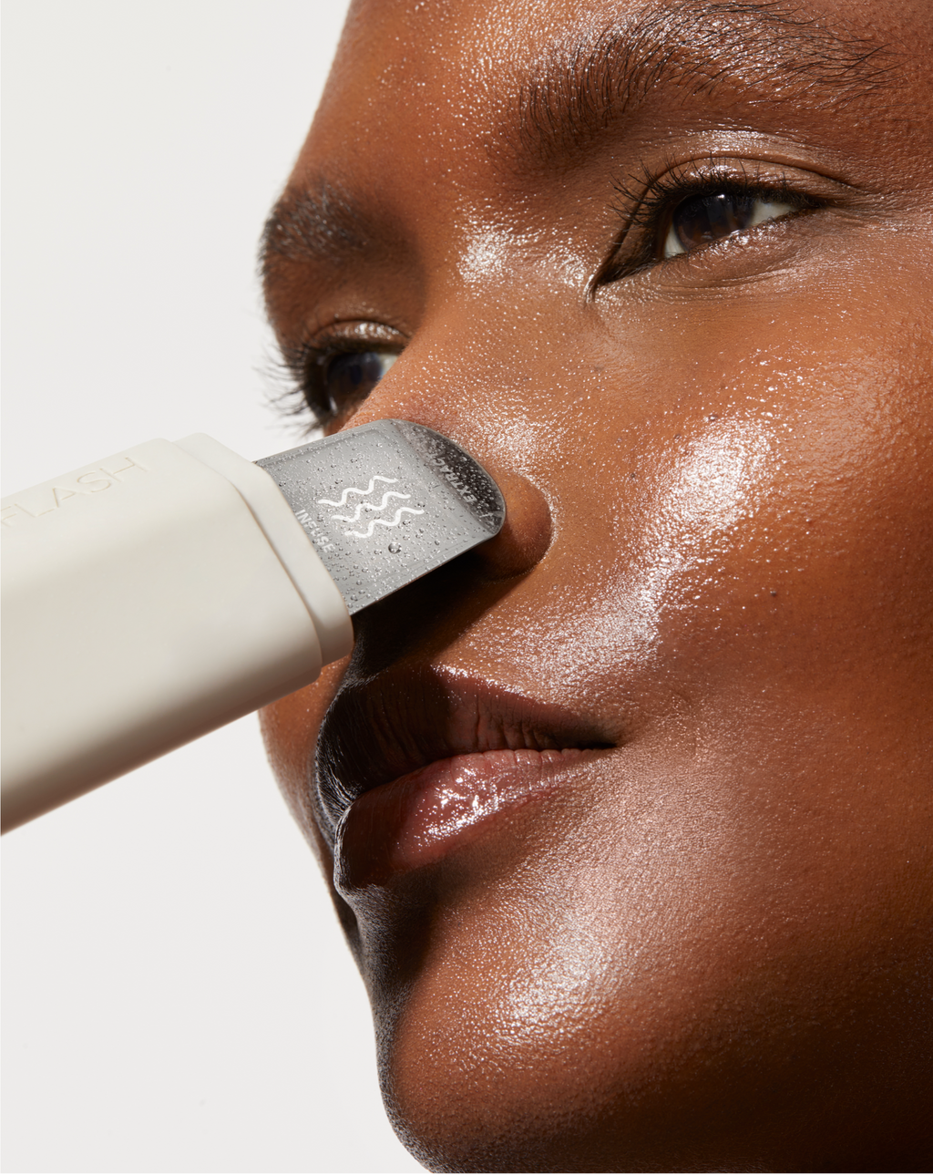 Before using Infuse Mode, apply your favorite serum, moisturizer or mask. Glide the flat part of the spatula over your skin. (Keep your fingertips on the silver strip.)